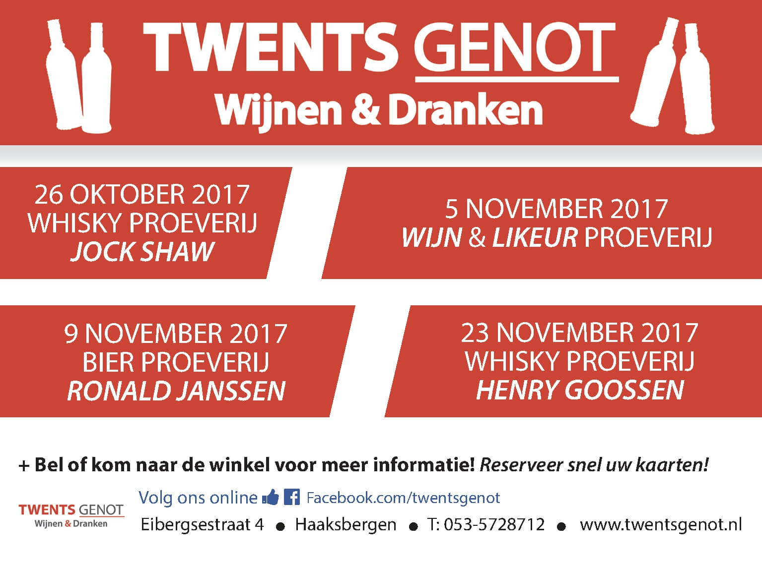 Meer informatie is te vinden op facebook.com/twentsgenot. Aanmelden kan bij Twents Genot Wijnen & Dranken aan de Eibergsestraat 4 in Haaksbergen, via telefoon 053-5728712, de facebookpagina of info@twentsgenot.nl